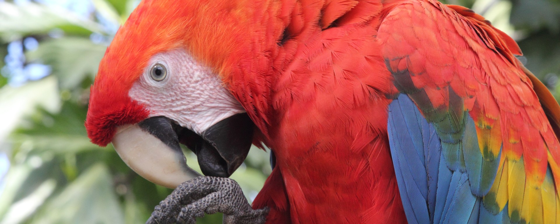 Amazingly, these resilient creatures were curious about us human visitors, and even permitted us to get quite close! One of these remarkable creatures at the sanctuary in rural Peru was this gorgeous Scarlet Macaw. He minded his own business, deliberately preening atop his perch four feet off the ground. I had hoped to see a macaw, but assumed that the sighting would be fleeting and with binoculars to see one far away. I felt so grateful to see one up close, to have the chance to admire the vibrant plumage and study his behavior for quite a while before it was time to continue on into the Amazon.