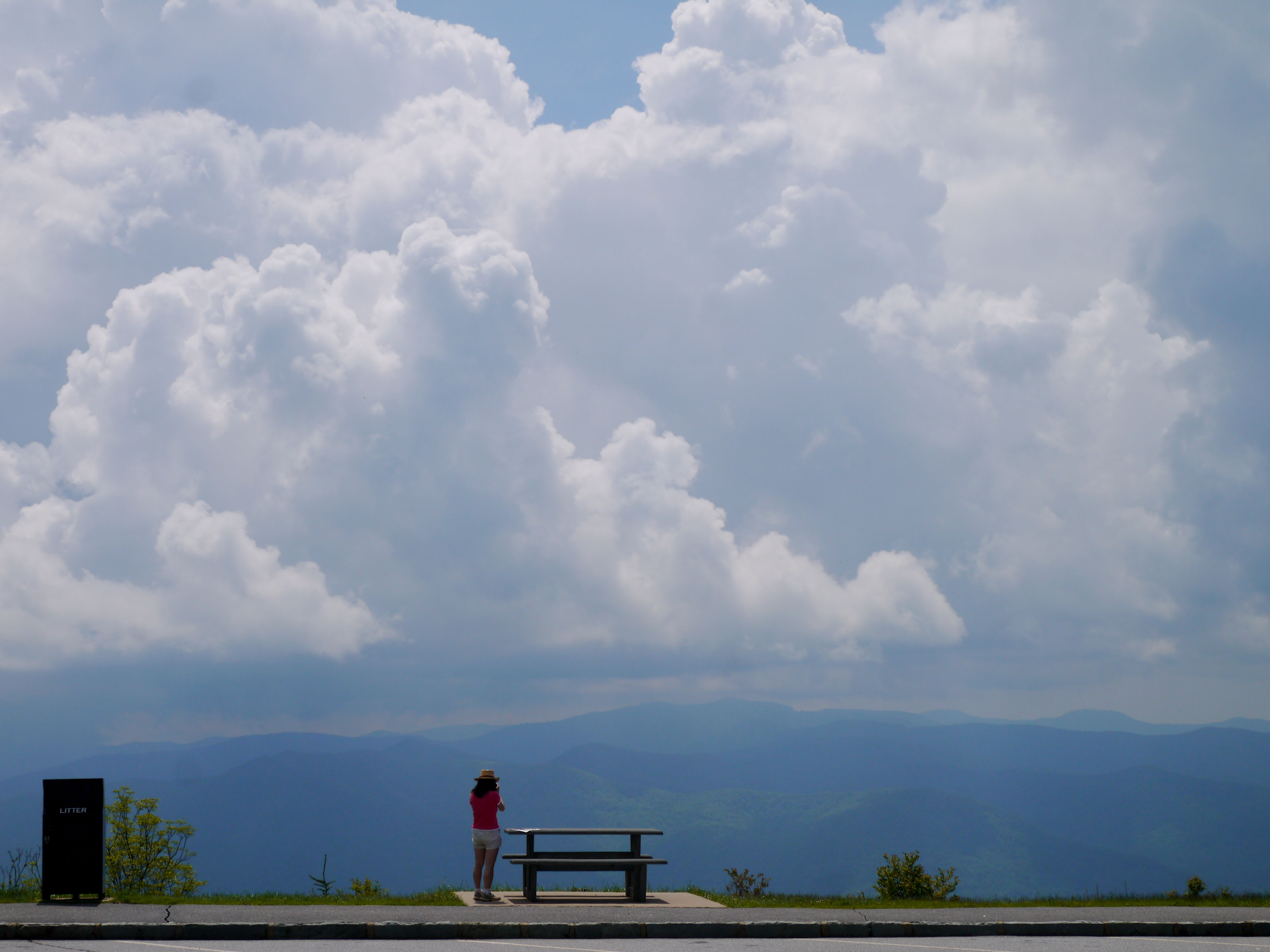 In between my first and second years of graduate school, I did a summer stint as a Research Associate for The Conservation Fund. My assignment was to investigate the economic benefits of public land along the Blue Ridge Parkway, and I spent hours and hours giving out surveys to visitors at Waterrock Knob. I can honestly say it was one of the most beautiful places I have ever been. The mountains stretched far into the distance, layering atop each other and glowing a gorgeous blue. On the afternoon pictured below, storm clouds rolled in to create an even more dramatic skyline.