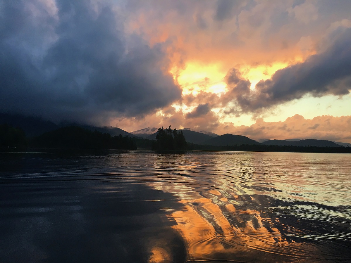 After an afternoon of severe thunderstorms, the lake calms just long enough for a peaceful kayak. As the dark storm clouds waft over the mountains, looming in the distance, the sunset lights the sky on fire.