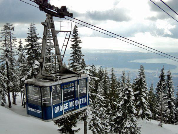 Here you can see the tramway at Grouse Mountain, a small ski/winter recreation resort in the mountains of North Vancouver. Since it was March, the temperature was in the sixties and sunny at the bottom of the mountain, so we basically took the tramway up into winter conditions.